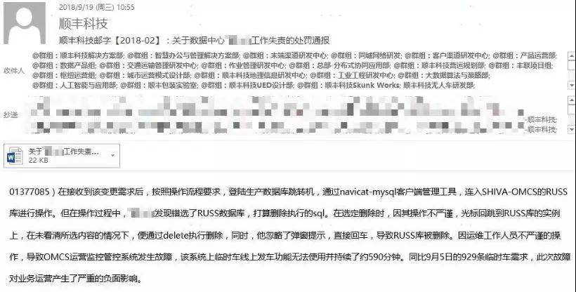 昨日,從順豐傳出來的這封郵件傳遍IT圈,簡意是:一位高級運維人員搞錯了一條命令,誤刪了某個數據庫,數據無法恢復,后果太嚴重了,順豐只好讓他被動跑路。