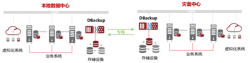 ◆ 對于本地信息系統進行容災備份,配合LAN-Free傳輸模式,提供完整統一高效的數據級容災能力。