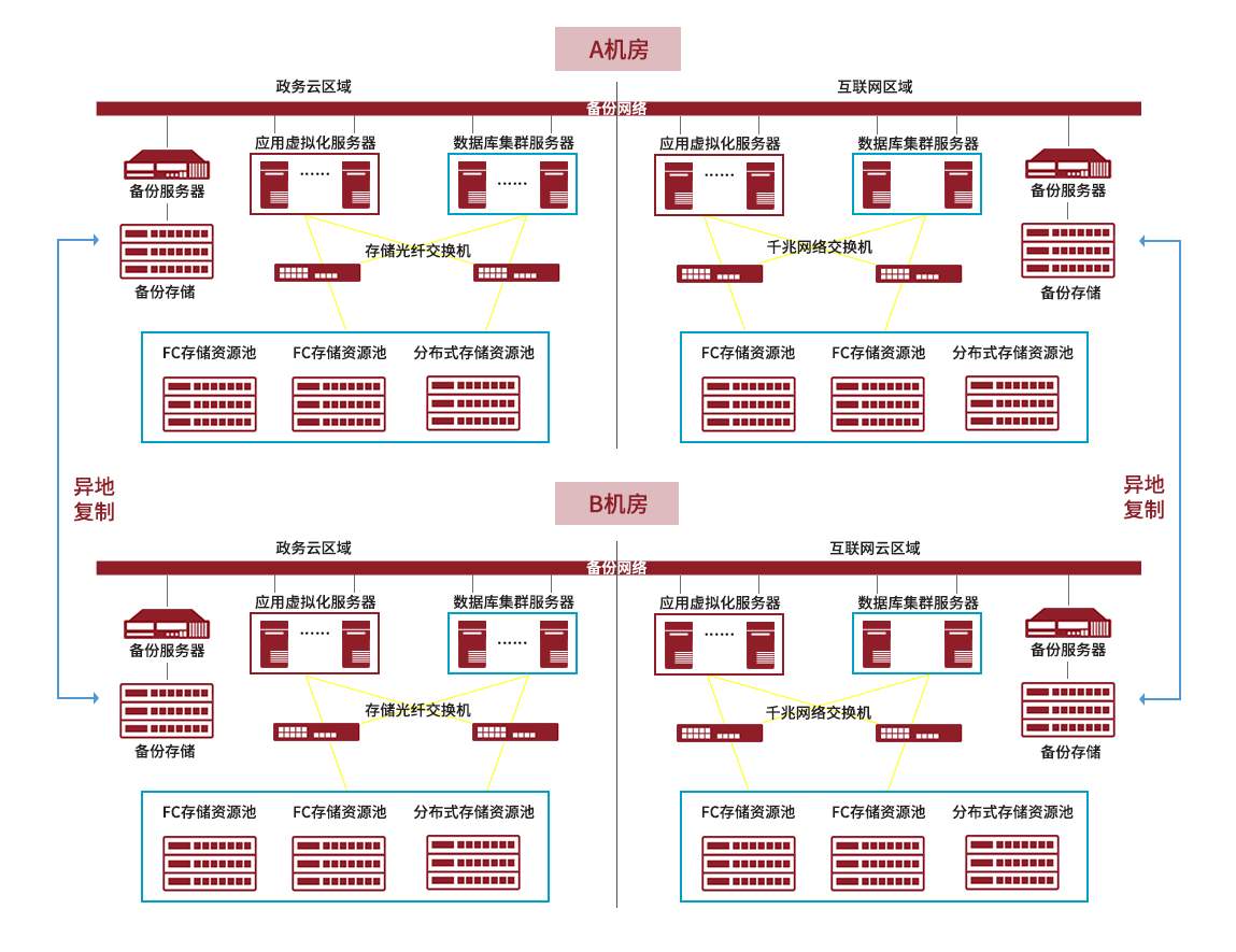 鼎甲在廈門電子政務云A、B機房的政務外網區(qū)和互聯網區(qū)分別部署了本地備份系統(tǒng),提供給互聯網區(qū)域、政務外網區(qū)域共300TiB的存儲容量,實現各自政務外網和互聯網區(qū)本地數據備份保護。且兩地各網絡區(qū)域之間備份系統(tǒng)通過專線互聯,實現了備份數據異地復制和異地存儲。