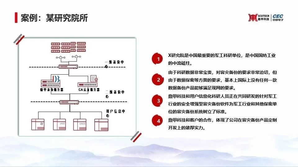 在與國家某軍工科研院所的合作中,它是中國國防工業(yè)的中流砥柱,鼎甲和其用戶信息化科研人員共同研發(fā)出針對軍工行業(yè)的安全增強型容災(zāi)備份軟件,為軍工行業(yè)和其他保密單位的容災(zāi)備份系統(tǒng)樹立了標(biāo)準(zhǔn),提高客戶災(zāi)難應(yīng)急能力。