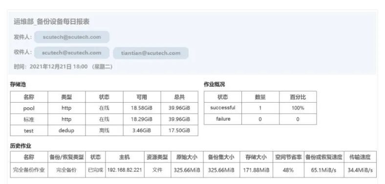 DBackup 平臺可以自動生成關于作業概覽、存儲池狀況、歷史作業等數據的運維報表,每天定時、自動發送到單位各部門指定郵箱,運維情況即時反饋。運維人員通過運維報表,全面掌握備份作業、資源等運維狀況,確保備份恢復運維工作有條不紊。