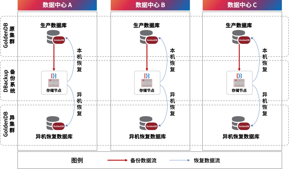 如上圖,GoldenDB 金融級(jí)分布式數(shù)據(jù)庫(kù)采用多中心的部署架構(gòu),分別在每個(gè)數(shù)據(jù)中心中部署存儲(chǔ)服務(wù)器,通過(guò)制訂就近備份的策略,備份數(shù)據(jù)僅在本地的內(nèi)網(wǎng)中傳輸和持久化存儲(chǔ)。多站點(diǎn)按數(shù)據(jù)中心就近備份的方案中,備份與恢復(fù)任務(wù)直接在本地?cái)?shù)據(jù)中心完成,解決了跨數(shù)據(jù)中心數(shù)據(jù)傳輸?shù)碾y題,極大提升了備份與恢復(fù)的效率。新方案的優(yōu)勢(shì)還包含: