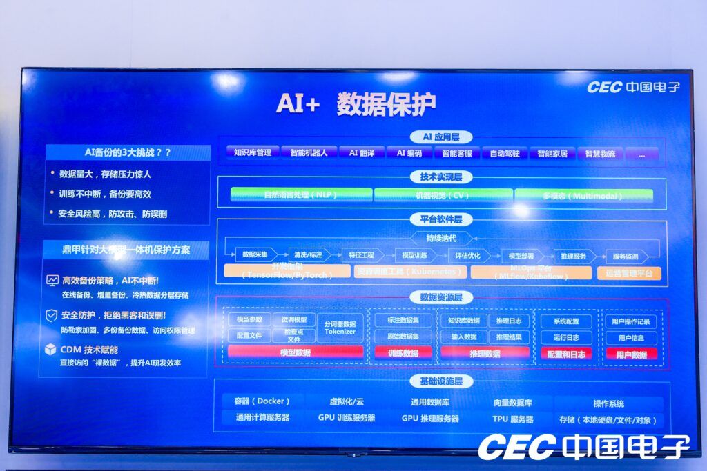 面對大模型一體機的海量數據和高風險挑戰,鼎甲展示了 AI 數據保護方案,具備以下三大優勢:
