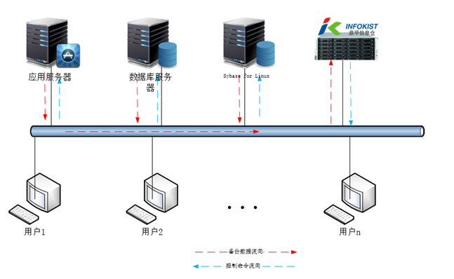 在各個需要做數據保護的生產服務器、用戶終端等設備上安裝鼎甲備份客戶端,將信息倉旁接入到公司的網絡環境,根據用戶的數據保護需求,制定備份作業計劃,鼎甲備份軟件根據計劃自動運行作業計劃,將各個數據點的數據集中備份到信息倉做集中在線數據保護。