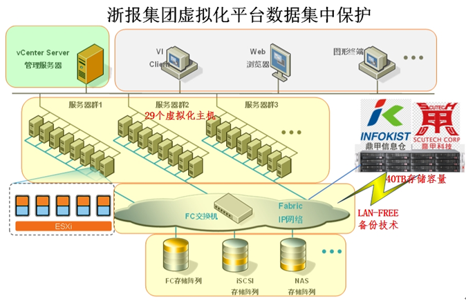 隨著虛擬時代的到來,虛擬化平臺被浙江報業(yè)集團信息中心采用,隨之而來的虛擬化平臺的數(shù)據(jù)備份問題也開始困擾管理人員。目前浙報集團眾多應(yīng)用系統(tǒng)運行在虛擬化的平臺,擁有29臺虛擬化宿主機平臺,這樣就需要專業(yè)完整的虛擬化平臺備份一體化解決方案,通過備份產(chǎn)品,自動將指定的400多個虛擬機通過LANFREE技術(shù)備份到備份一體化設(shè)備,每臺虛擬機可以保留1周的備份時間點,當(dāng)虛擬機崩潰、核心數(shù)據(jù)丟失、應(yīng)用被破壞甚至宿主機損毀的情況下,用戶能通過簡單的圖形化快速恢復(fù)備份虛擬機到指定時間點,為用戶虛擬化平臺運行保駕護航。